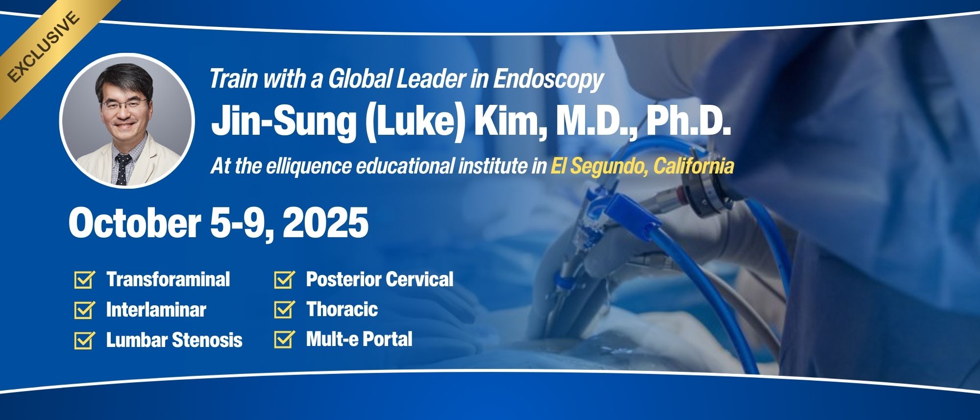 Join us October 5–9, 2025, at the Elliquence Educational Institute in El Segundo, California for an unparalleled opportunity to train with one of the world’s foremost leaders in endoscopic spine surgery, Dr. Jin-Sung (Luke) Kim, M.D., Ph.D.